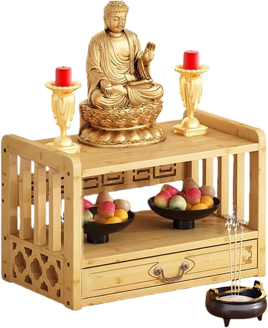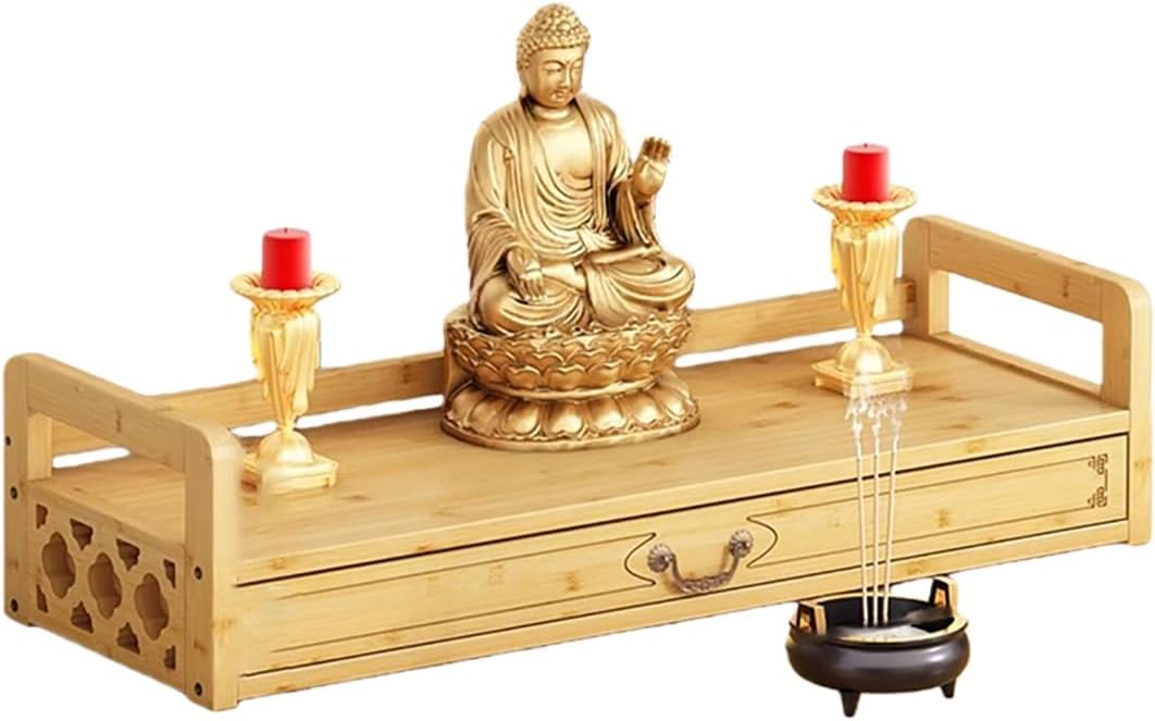 Tabletop Personal Meditation Table Household Incense Table with Drawers Chinese Buddhist Altar ShelfProduct DescriptionMade from thickened natural bamboo, this Buddha Altar Shelf provides exceptional practicality and stability for long-term use. The solid bamboo structure is not only eco-friendly but also resistant to warping or cracking, ensuring that your sacred space remains sturdy and serene for years to come.The cabinet features multiple compartments of varying sizes to hold offerings and spiritual essentials. The carved, hollow cabinet doors are not only decorative but also practical—allowing for ventilation while maintaining a clean, organized appearance.Designed with practicality in mind, the altar includes an extendable shelf and pull-out tray, offering flexible space for incense burners, candles, or ritual accessories. When expanded, it provides a larger operating surface; when folded, it saves space—ideal for compact meditation rooms or small temple areas. The drawers and pull-out tray make organization simple and efficient, allowing you to neatly store prayer books, candles, rosaries, or other personal items while keeping your altar area uncluttered.The curved, raised corners on the tabletop are designed to prevent items from slipping off while adding a graceful, traditional flair reminiscent of classical temple furniture. Each surface is finely polished to a smooth, scratch-free finish, ensuring comfort and safety in daily use.Whether you’re building a personal shrine at home, creating a dedicated Meditation Altar Table for Temples, or setting up an offering table for family remembrance, this piece combines artistry, cultural heritage, and practicality.Product DescriptionProduct name:Altar Table with Double Door Storage,Chinese Buddhist Temple Meditation Table,Personal Shrine Altar Table for Buddha, buddha statue offering table, pet ashes house pooja table,Product features:After multiple polishing, the product surface is smooth and delicate.Product use: This product is suitable for sacrifice, incense burning, commemoration, etc.Package includes: altar table*1 (including installation tools)Note:This product only includes the altar table, not other Buddha statues and other ornaments.There may be an error of 1-3 cm.Images are for illustrative purposes; additional items shown are not included.Colors may vary slightly due to monitor differences.